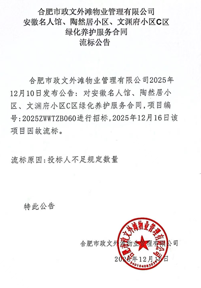合肥市政文外灘物業(yè)管理有限公司安徽名人館、陶然居小區(qū)、文淵府小區(qū)C區(qū)綠化養(yǎng)護(hù)服務(wù)合同流標(biāo)公告