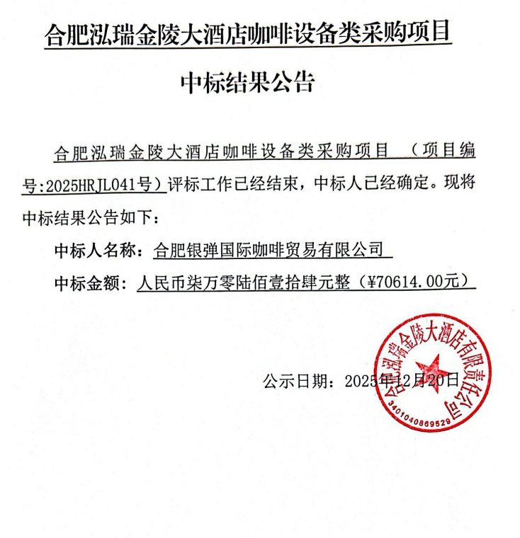 合肥泓瑞金陵大酒店咖啡設備類采購項目中標結(jié)果公告