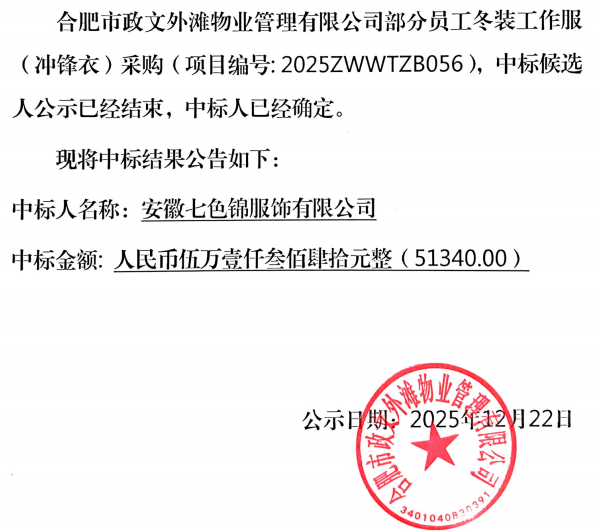合肥市政文外灘物業(yè)管理有限公司部分員工冬裝工作服(沖鋒衣)采購中標(biāo)結(jié)果公告