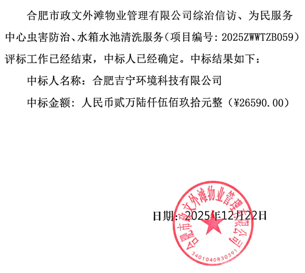 合肥市政文外灘物業(yè)管理有限公司綜治信訪、為民服務(wù)中心蟲(chóng)害防治、水箱水池清洗服務(wù)中標(biāo)結(jié)果公告