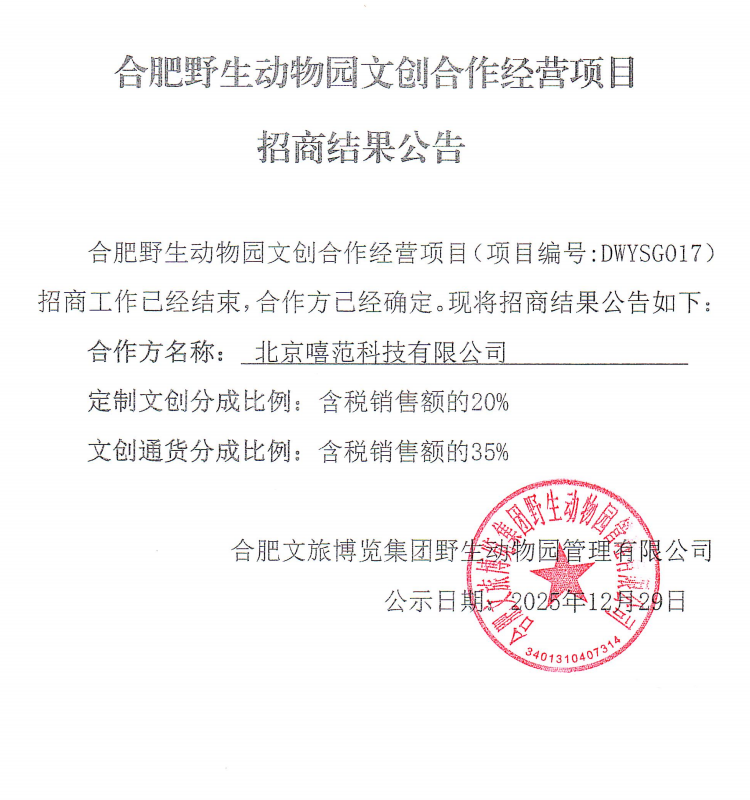 合肥野生動物園文創(chuàng)合作經(jīng)營項目招商結(jié)果公告